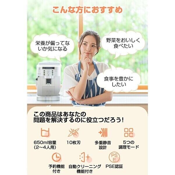 (1)栄養の偏りが気になる方にオススメ。立体的な10枚刃と強力パワーモーターで素早く食材をカットして仕上げます。(10枚刃で刻む→自動加熱→攪拌→完成!)