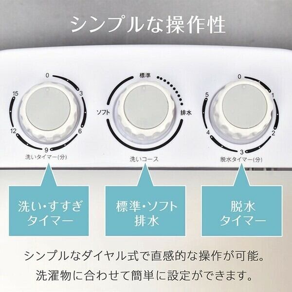 (4)シンプルなダイヤル操作:❶洗い・すすぎタイマー、❷標準・ソフト/排水、❸脱水タイマー