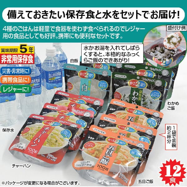 ・ご飯4種(白飯、わかめご飯、五目ご飯、チャーハン)×各3袋(計12袋)、水(500ml)×6本